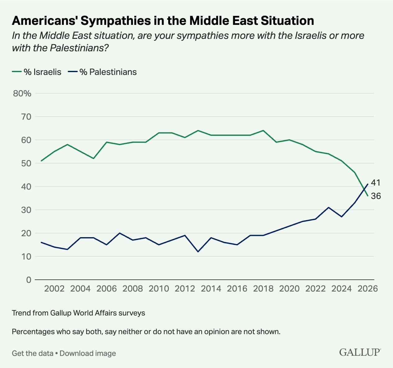 지난 2월 갤럽에서 발표한 내용에 따르면 미국인의 41%가 팔레스타인에 공감한다(sympathize)고 밝힌 반면, 이스라엘에 공감한다는 사람은 36%에 그쳤다. 갤럽에 따르면 이 차이는 통계적으로 유의미한 차이는 아니지만, 지난 20여년 간의 비슷한 조사에서 이스라엘이 꾸준히 우위를 점했던 것과는 분명히 다른 결과다. 특히 미국인의 57%가 팔레스타인 사람들의 독립 국가 수립을 지지했다. 조사가 이뤄진 이래 최고치에 가깝다.