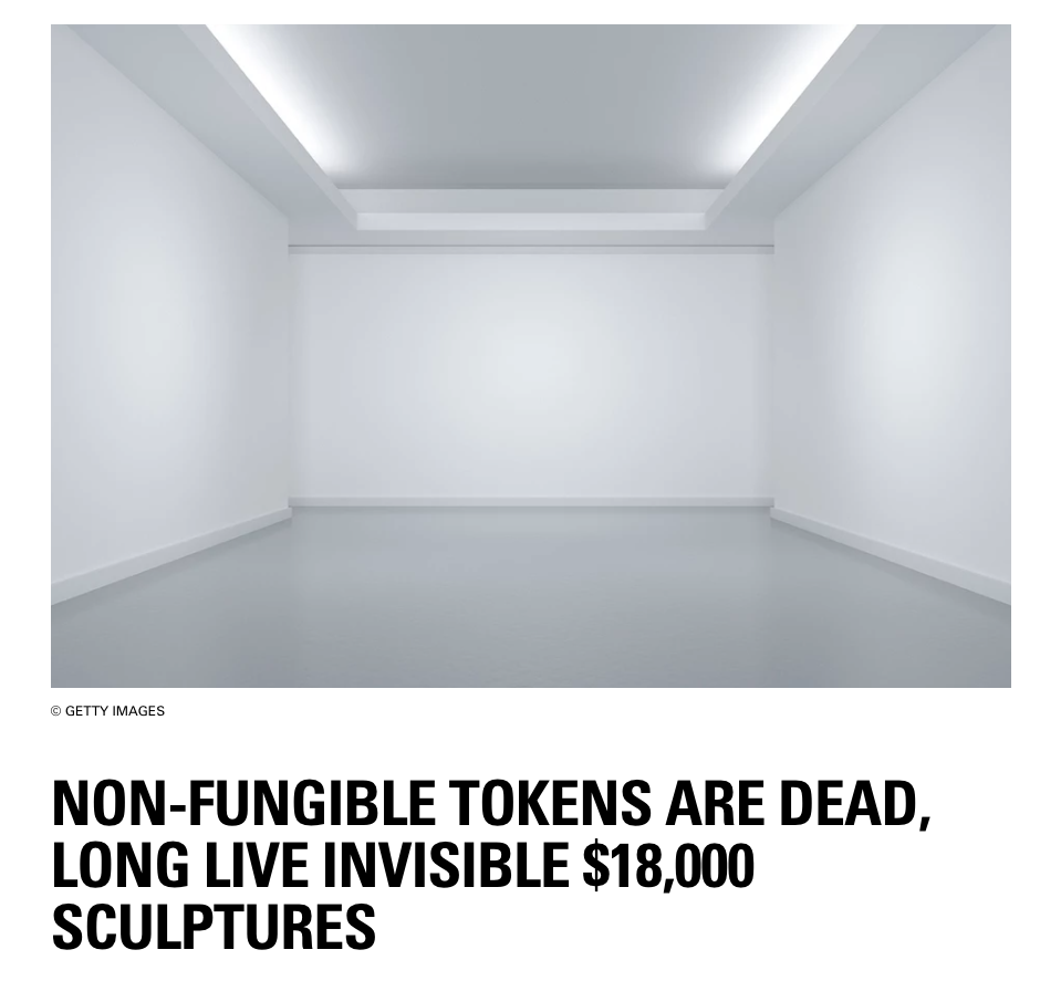 이런 약속만 끌어낼 수 있다면 굳이 NFT일 필요도 없다. 최근 이탈리아에서는 살바토레 가라우라는 60대의 아티스트가 ‘로 소노(Lo Sono)’라는 조각상을 경매를 통해 우리 돈으로 약 2000만원에 팔았다. 여기까지는 별다를 게 없는 일인데 화제가 된 것은 이 작품이 실제로 존재하지 않기 때문이다. 하지만 아티스트는 이 작품은 “공기와 정신(spirit)으로 만들어져 있기 때문에 눈에 보이지 않지만 존재한다”면서 “이 작품은 당신이 상상력을 발휘하게 만든다”고 주장했다.