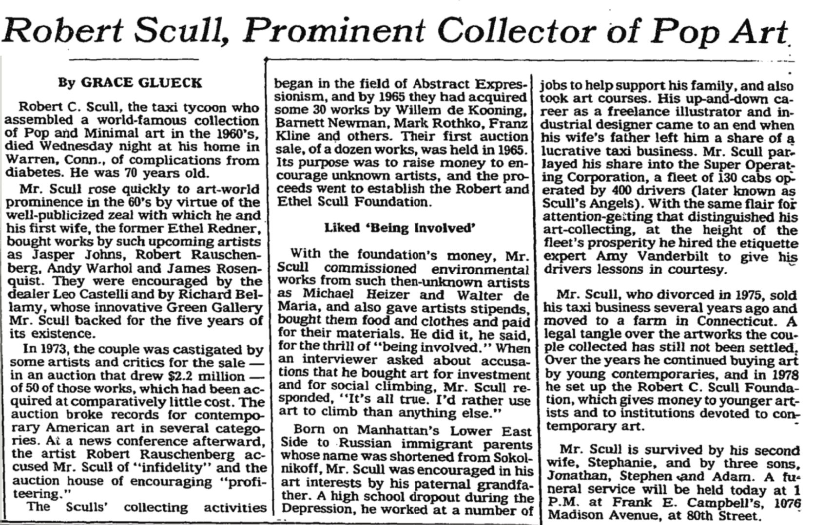 그런데 스컬 부부는 신흥부자였다. 남편은 프리랜서 일러스트레이터로 근근이 먹고 살던 사람인데, 부자 아빠를 둔 에셀과 결혼하면서 부자로 살 게 되었다. 하지만 에셀의 아버지도 전통적인 뉴욕의 부자는 아니었고, 뉴욕에서 130대의 택시와 400명의 기사를 거느린 대형 택시 사업을 하면서 부자가 된 인물이다. 부모로 부터 돈과 교양을 물려받아 소위 '상류사회'에 있던 전통적인 예술품 수집가들과는 다른 종류의 사람들이다. 이런 스컬 부부를 당시 뉴욕의 상류사회 사람들이 어떻게 바라봤는지는 1986년 로버트 스컬(부부는 1975년에 이혼했다)이 세상을 떠났을 때 뉴욕타임즈에 실린 부고 기사를 보면 눈치챌 수 있다.