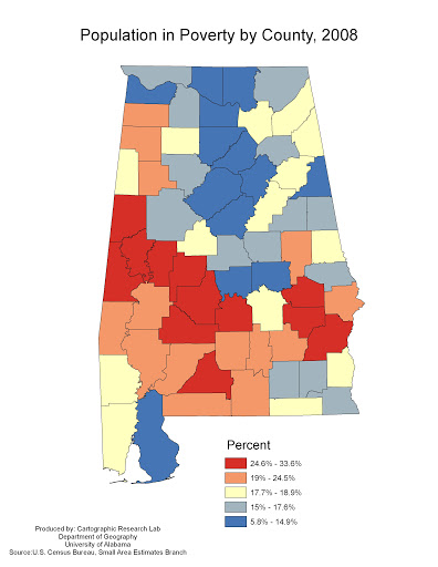따라서 맨 위의 그림에서 이해해야 하는 건 미국 인종 문제의 본질이 경제력 박탈에 있고, 그 영향은 지금도 이어지고 있다는 사실이다. 참고로, 아래 지도는 앨라배마주의 빈민층 비율을 카운티별로 표시한 것이다. 어느 카운티에 가난한 사람들이 모여 사는지 금방 알 수 있다. (빈민층 비율이 높은 붉은색의 띠가 중간에 끊어진 지역이 현대자동차가 2002년에 자동차 공장을 세운 몽고메리 카운티).