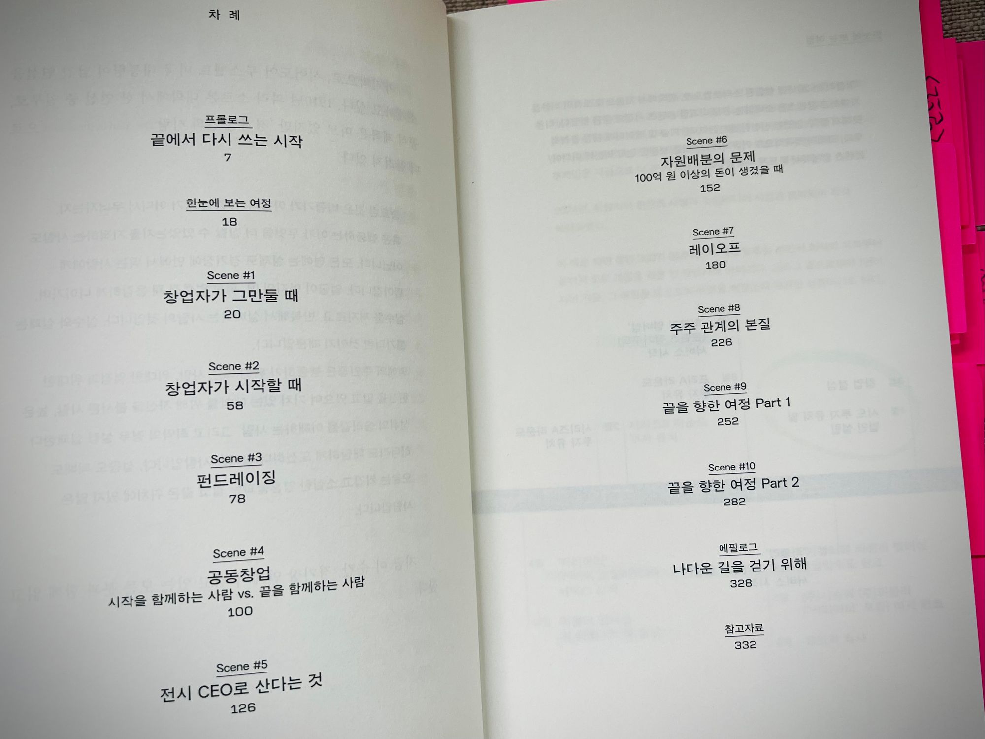 창업하게 된 계기와 과정은 2장(Scene #2)에 처음 등장하고, 그 후에는 스타트업을 시작한 사람들이 직면하게 되는 상황과 고민점들을 주제별로 묶어 전개한다. 공동창업이 과연 필요한 것인지 (저자는 '공동창업자'보다 '동업자'를 더 중요하게 생각한다) 자원배분이 왜 중요하고, 왜 자신을 포함한 대부분의 CEO가 여기에 실패하는지, 사람을 내보내는 것이 얼마나 괴로운 경험인지 등등이 생생하게 기록되어 있다. 얼마나 생생하냐면, 5년, 7년, 10년 전에 나눈 대화들을 아주 작은 디테일까지 적혀있다. 이게 어떻게 가능했을까?